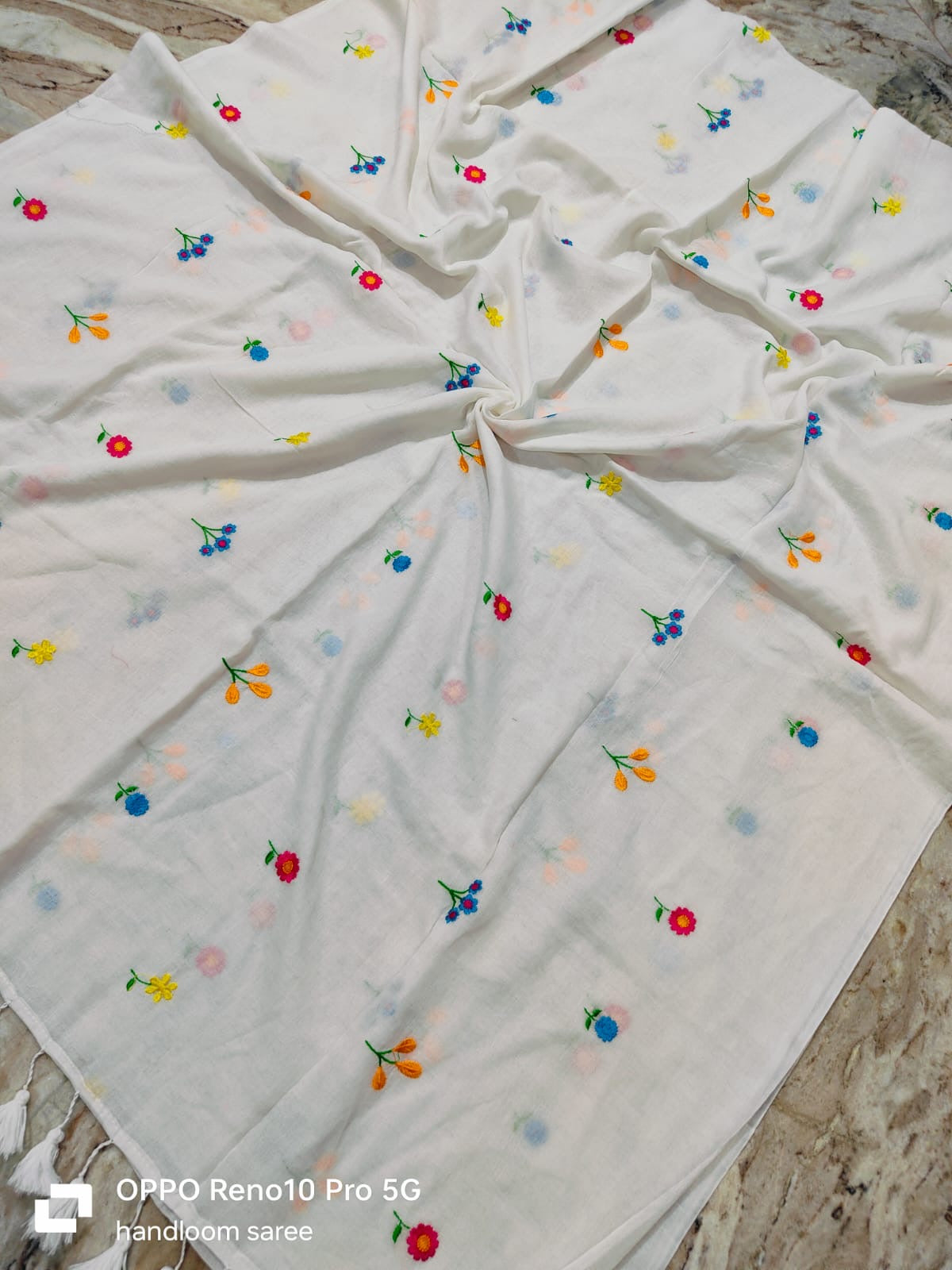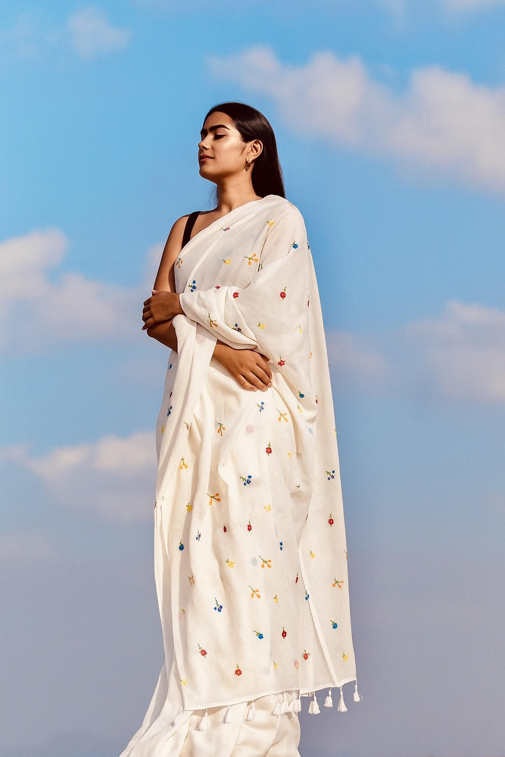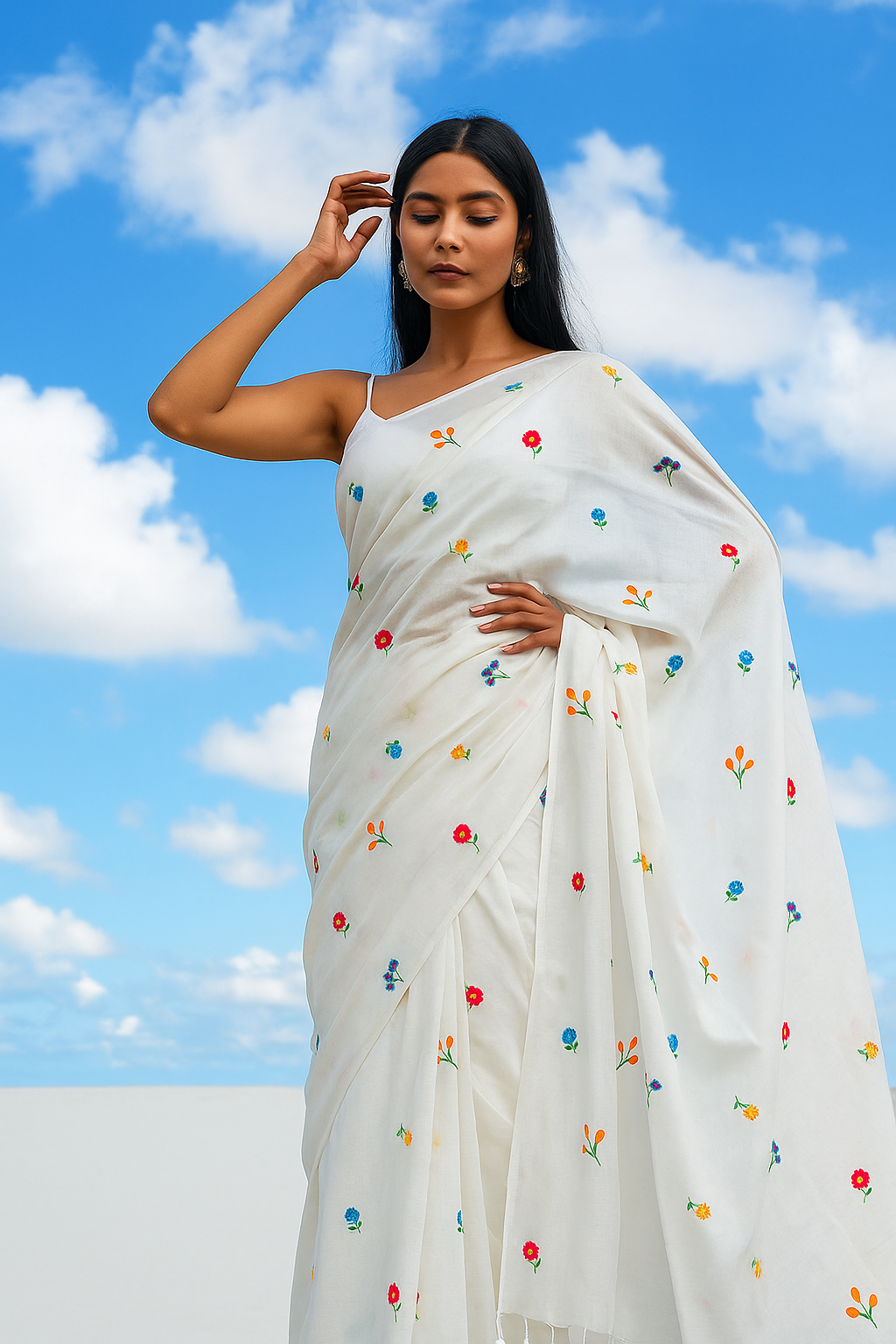 soft like a morning breeze and adorned with embroidered floral whispers-this saree tells as story of grace, simplicity and joy. Every thread is celebration of indian craftsmanship, every flower a little reminder to bloom where you are rooted.